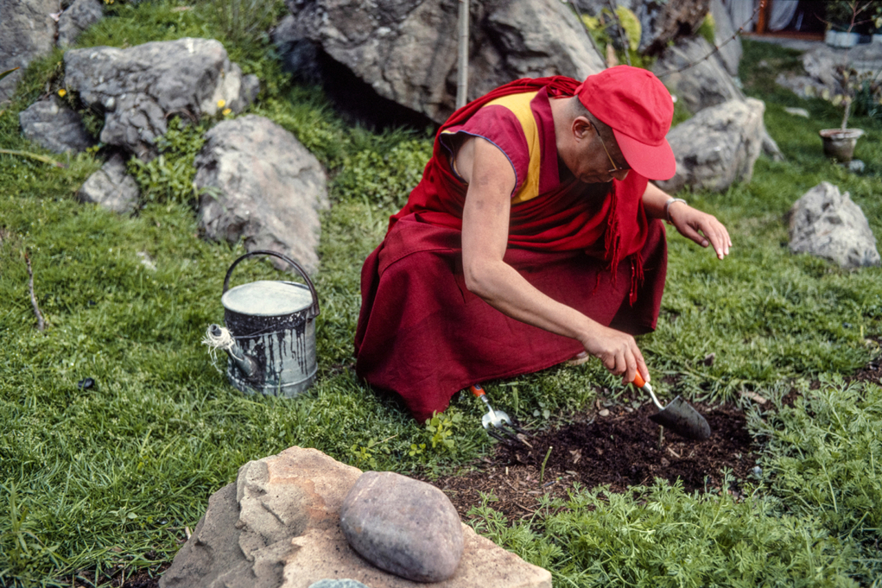 В саду своей резиденции. Природа – основа всей жизни. Все формы жизни взаимосвязаны. «Наша планета – наш дом, наш единственный дом. Куда нам идти, если мы его разрушим?» – говорит Далай-лама. Дхарамсала, штат Химачал-Прадеш, Индия. 22 февраля 1990 г.
