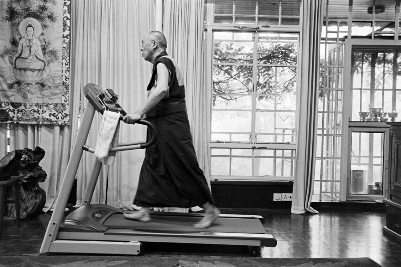 Врач посоветовал Далай-ламе уравновешивать долгие часы медитации физической активностью на беговой дорожке. Первоначально Далай-лама считал эти 15 минут в день пустой трантой времени, но вскоре понял, что может провести это время с пользой, молясь обо всех живых существах. Резиденция Далай-ламы, Дхарамсала, штат Химачал-Прадеш, Индия. 15 августа 2004 г.